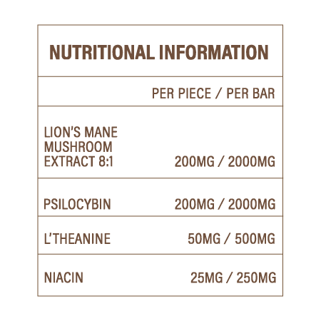 Ingredients: 65% organic cocoa mass, cane sugar, cacao butter, lion’s mane mushroom extract 8:1, l’theanine, psilocybin, niacin.  May contain traces of nuts and/or dairy