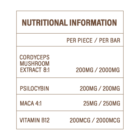 Chocolate Bar Ingredients: 65% organic cocoa mass, cane sugar, cacao butter, ashwagandha, chaga extract 8:1, reishi extract 8:1, psilocybin, bacopa. May contain traces of nuts and/or dairy